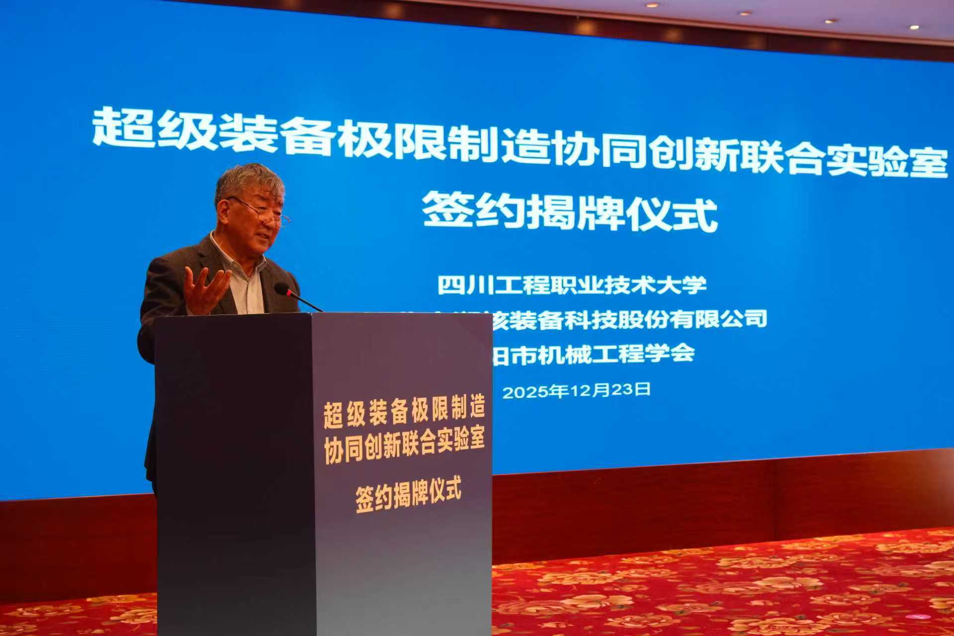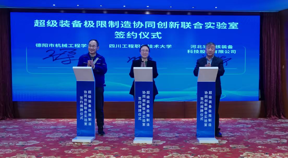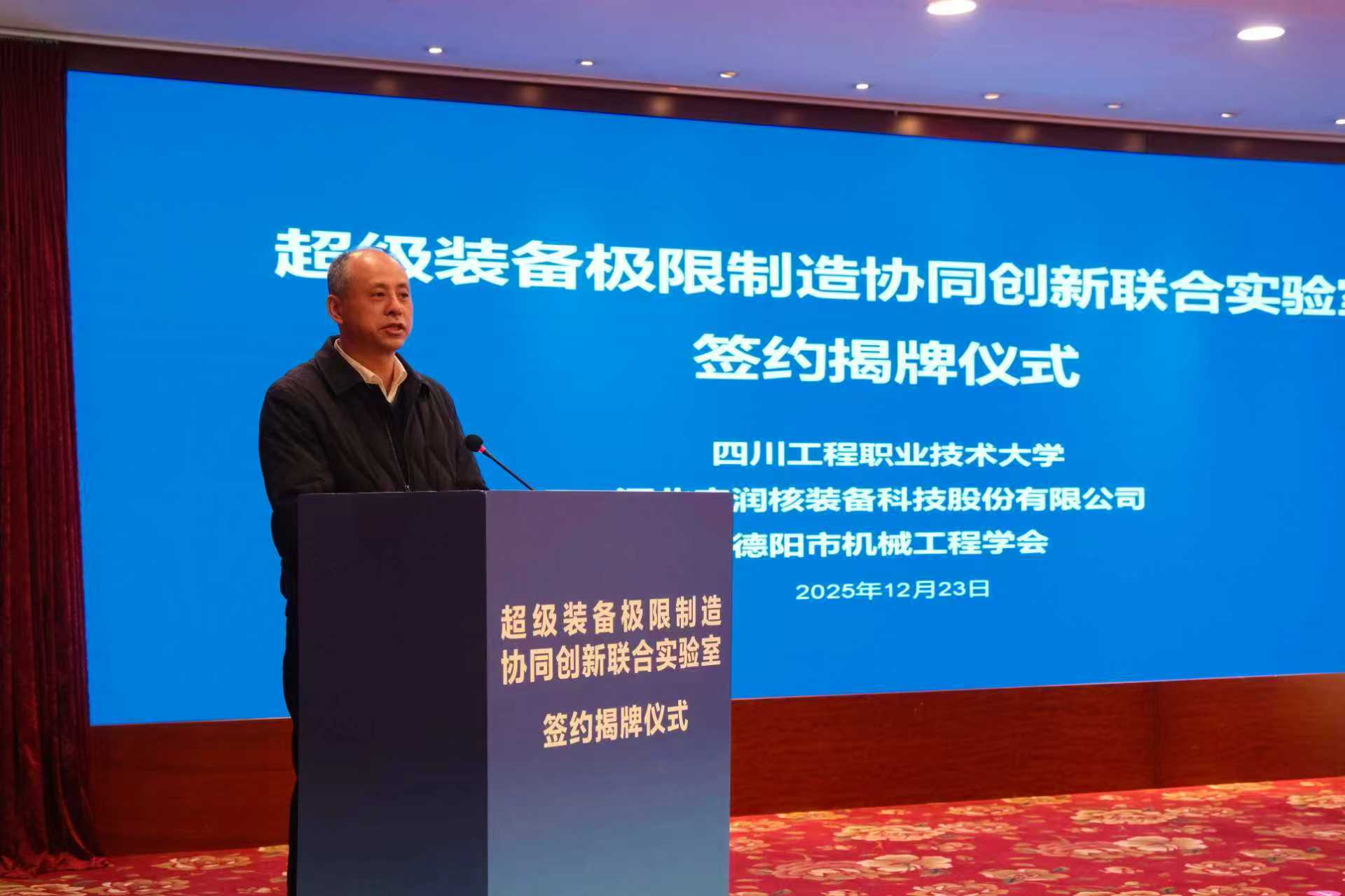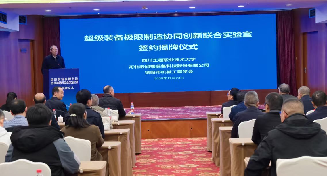 2025年12月23日,“超级装备极限制造协同创新联合实验室”(以下简称“实验室”)签约暨揭牌仪式在德阳旌湖宾馆隆重举行。该实验室由四川工程职业技术大学、河北宏润核装备科技股份有限公司、德阳市机械工程学会三方共同组建,旨在建设聚焦高端装备制造领域的协同创新平台。此次合作基于扎实的前期调研基础。此前,四川工程职业技术大学联合德阳市机械工程学会专程赴河北宏润核装备科技股份有限公司进行实地考察与技术交流,为三方共建实验室奠定了坚实基础。
